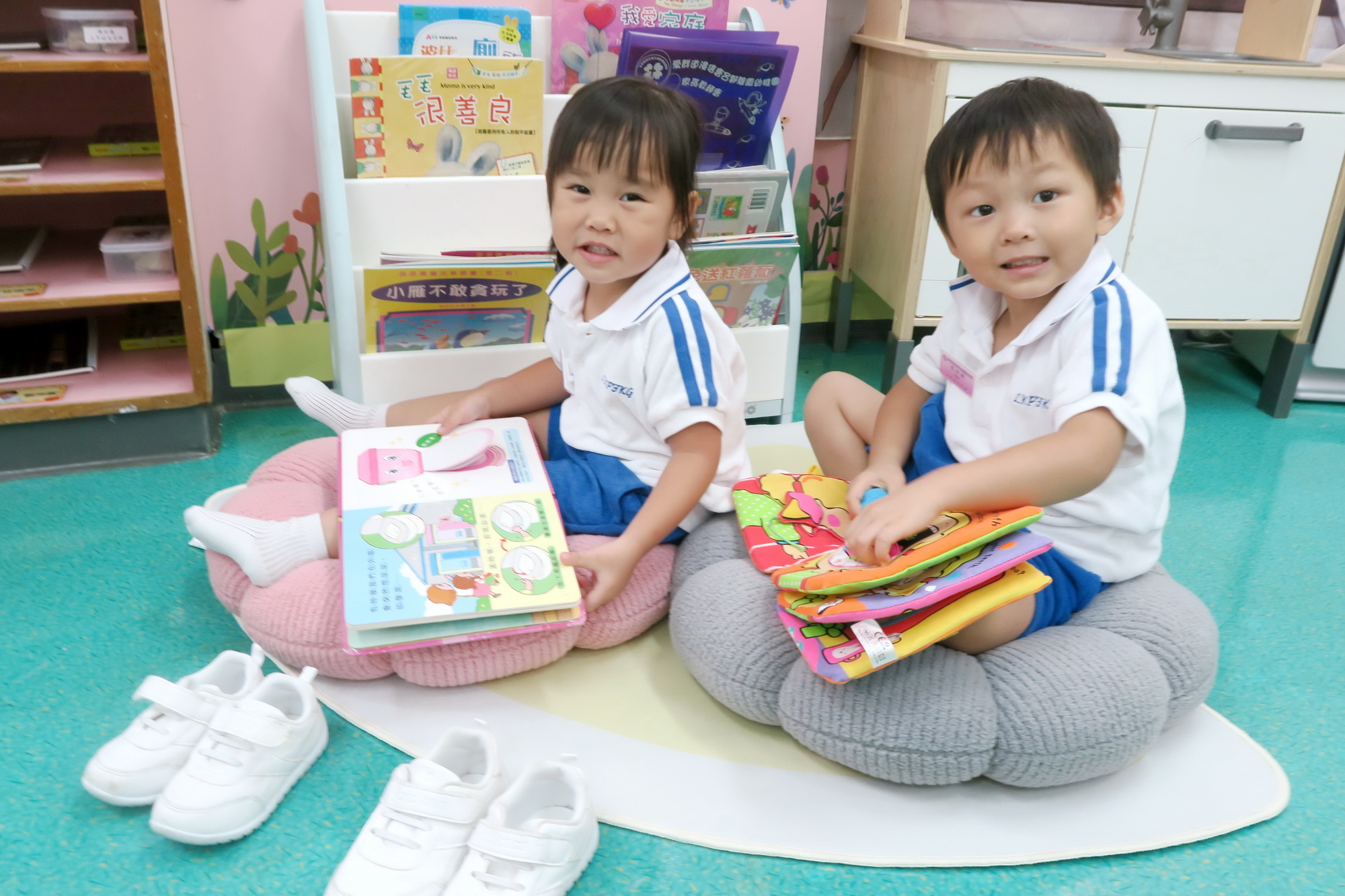 我們在圖書角看圖書。